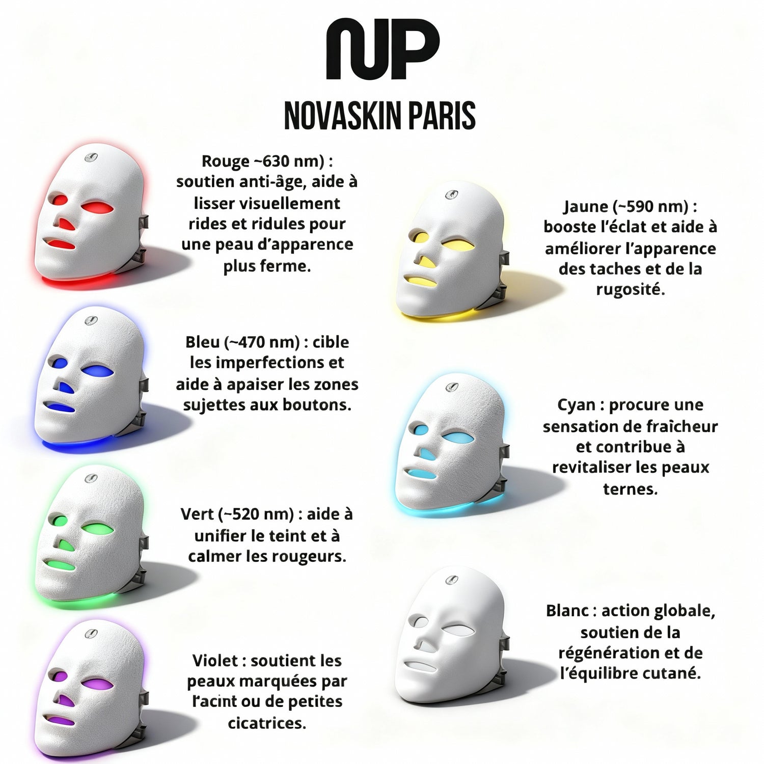 7 couleurs ciblées : rouge ~630 nm (fermeté/élasticité), bleu ~470 nm (imperfections/séboregulation), vert ~520 nm (apaisement/équilibre), jaune ~590 nm (éclat/rugosité), violet (marques), cyan (vitalité), blanc (régénération).